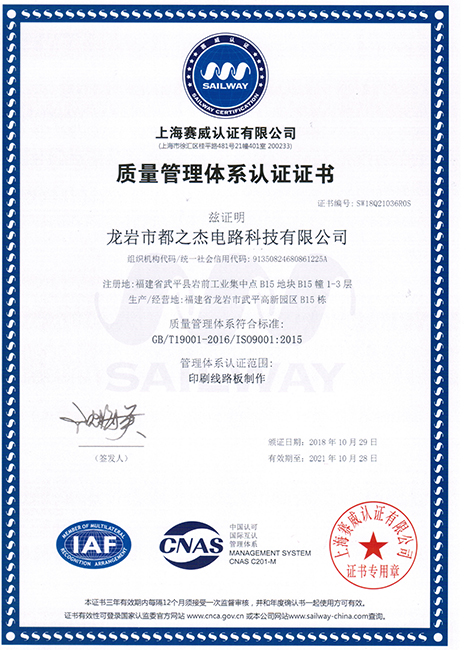 自1997年成立以來,都之杰已經獲得ROHS產品認證,各項技術指標達到國家先進水平,質量和信譽是企業(yè)的生命,我們一直以來持續(xù)不斷改善產品的質量,以質量取勝市場,提高公司的信譽度。多年來憑優(yōu)良的產品質量、準時快捷的供貨和周到細致的服務,深得國內外客戶的好評。我們已經獲得良好的聲譽和客戶的信任,并逐漸成為客戶可信賴的、能長期合作的印刷線路板戰(zhàn)略合作供應商。我們堅持向國內外先進企業(yè)學習并不斷提升自主創(chuàng)新。公司擁有經驗豐富及穩(wěn)定的團隊,視質量為企業(yè)生命,嚴格推行ISO9001質量管理體系,符合ROHS標準,并獲得了UL安全認證、TS16949和CQC認證。